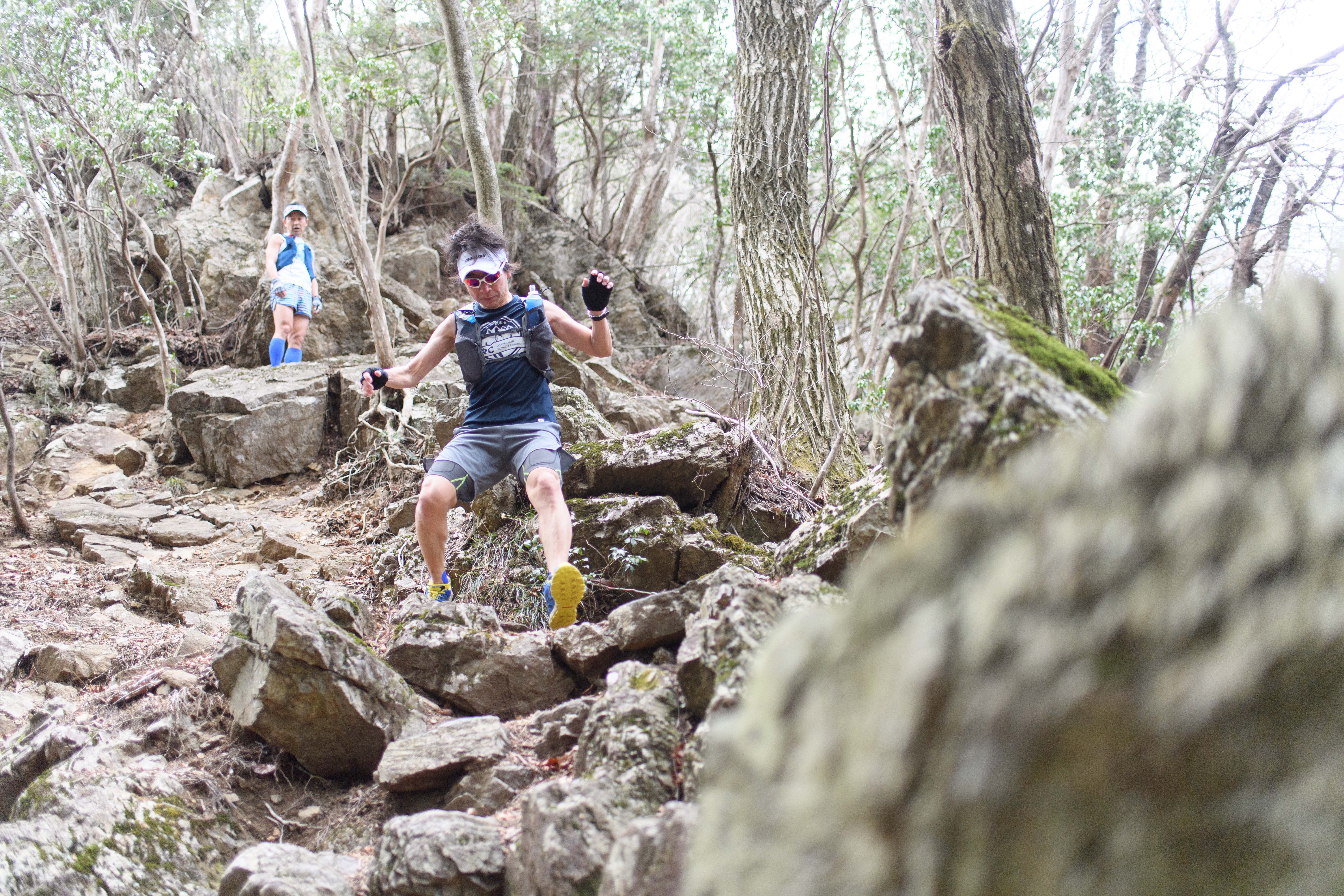神社の境内脇にある長谷川恒男記念碑に挨拶してから、大岳山に向かい始めると、やわらかな土のトレイルから一転、岩の多い路面が続く。時には鎖や鉄階段が設置された岩場もあり、足取りも慎重になる。大岳山の直下、大岳神社の鳥居で標高1150m。このコースで最も標高の高い地点だ。
